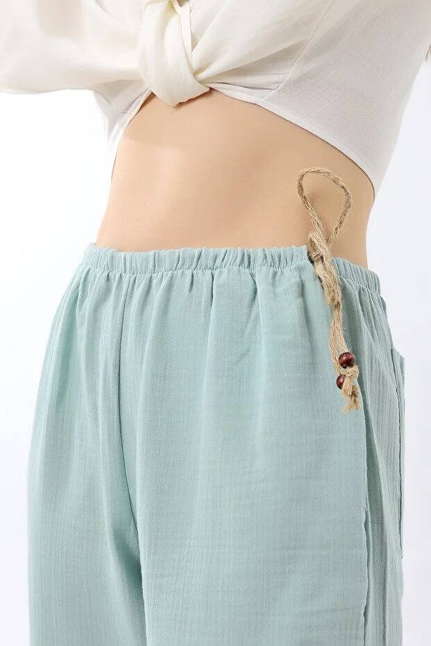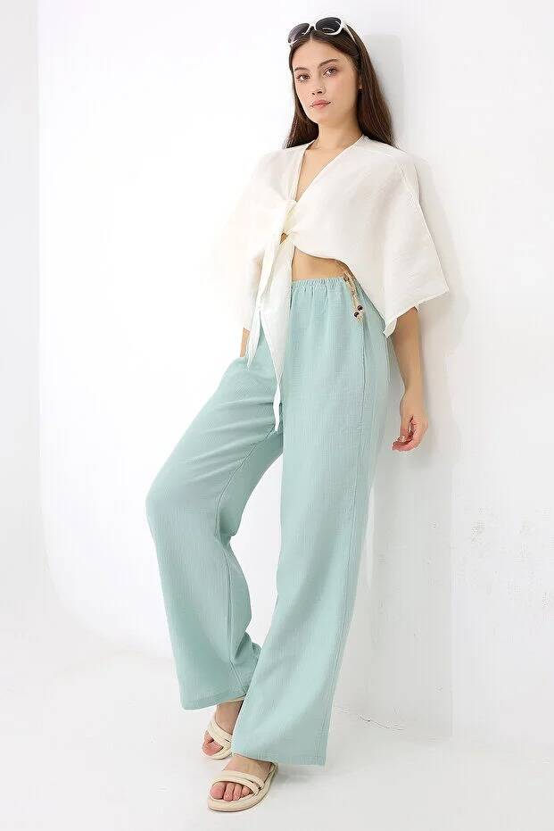 Müslin Beli Lastikli Bol Kesim Su Yeşili Pantolon